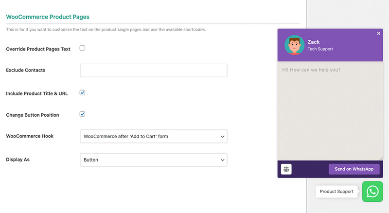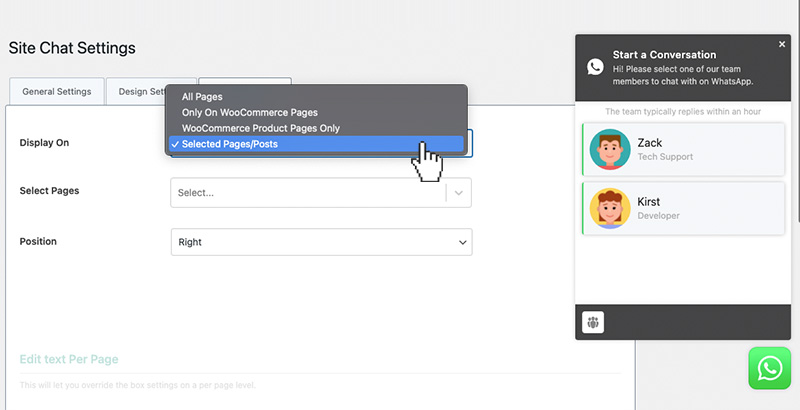 Select between different page display options to only display the chat on WooCommerce pages, WC product pages, or specific pages you choose to display the chat on.